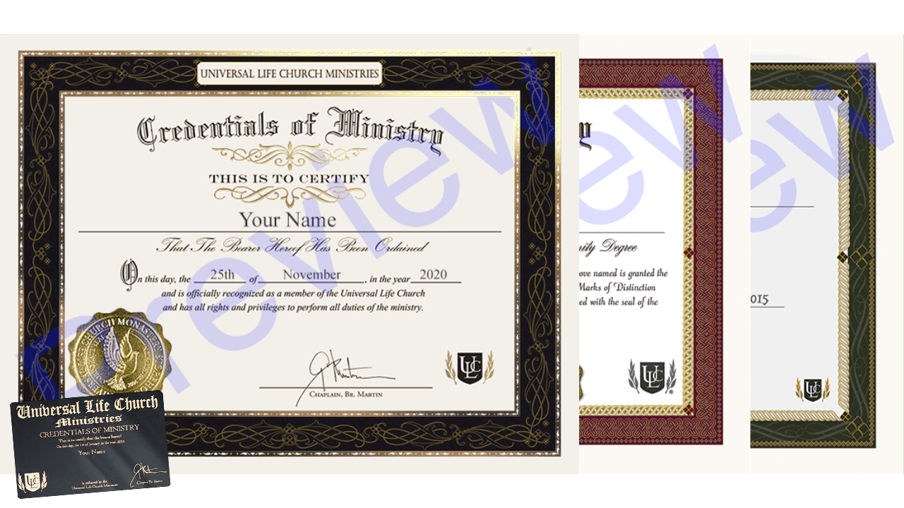 Welcome to the ULC Be A Minister supplies catalog, where you’ll find all the materials and resources you could ever need to conduct your duties as an ordained minister! As an ordained minister, we invite you to complete your order on our sister website by clicking any of the links below. No matter where your ministerial journey takes you, we can provide the proper supplies to ensure that your endeavors are successful. Here’s an overview of what’s included in our catalog: