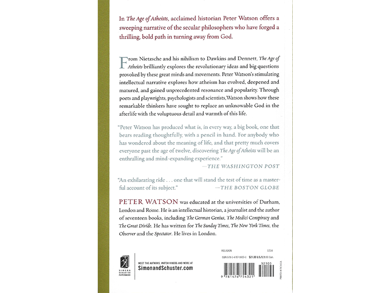 Historian and author Peter Watson discusses the evolution of atheism and some of the revolutionary ideas from great secular minds throughout history. This book explores how atheism came to be as it is today, and how its popularity shapes the world as we know it for the better. This is a paperback book of roughly 630 pages.