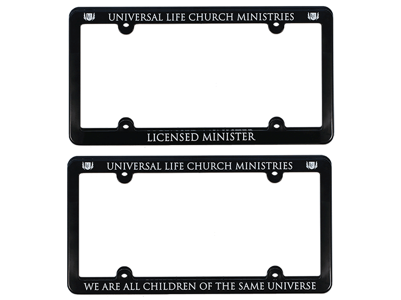 This 2 pack includes a set of licence plate frames sporting the ULC logo. One of the frames is designed with our church motto that reads "We are all children of the same universe" and the other says "Licenced Minister" These are very handy to Identify your vehicle and yourself as a proud minister and member of the ULC Ministries family.
