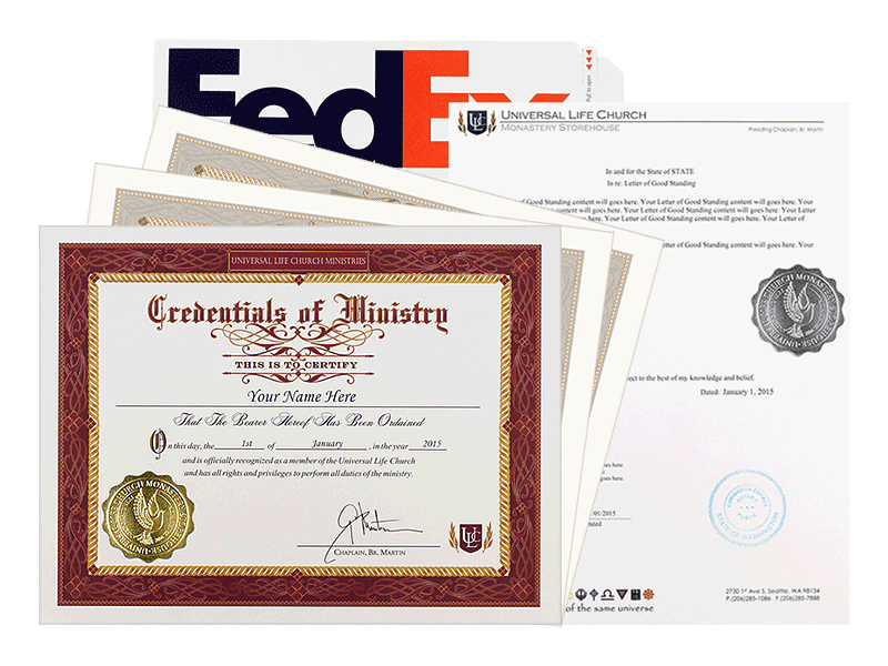 Sometimes despite best efforts, ministers find themselves in need of legal church documentation immediately. If you find yourself in that situation, we recommend the Emergency Wedding Bundle for you. We've put together two of the most commonly required documents for performing weddings and packaged it with two commemorative certificates of marriage you can gift to couples. Once you begin the checkout process, the website will automatically select the fastest shipping method we have and orders are shipped the business day after the order is placed.