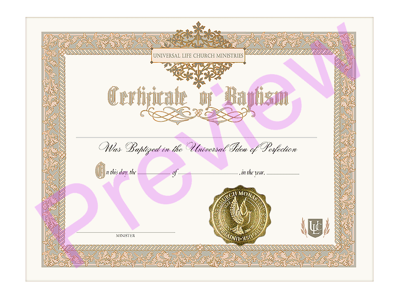 A baptism is a moment that will be remembered and cherished long after the ceremony has taken place. With this certificate of baptism you can give a gift that will keep that memory alive. The elegantly designed certificate has spaces for the name of the baptized person, the date of the baptism, and the signature of the minister that performed the ceremony; along with the raised gold seal of the ULC.