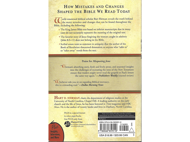 Bart Ehrman, a world renowned scholar of religious studies, uses this book to highlight many mistakes and changes he has found throughout the Bible. He highlights common scribal errors, stories in the Bible that should have never been included in the text, and inferior manuscripts used for the basis of the King James version that have caused inaccuracies.