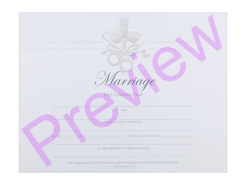 This commemorative marriage certificate features a beautifully embossed dove clutching the ribbons of matrimony. Also featured on the certificate is the bible verse Thessalonians I, 3:12, a verse that references the love a couple has for each other.